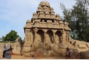 முதலாம் நரசிம்மவர்மன் என்னும் மாமல்லனின் அரிய படைப்பான, ஒற்றைக் கல்லில் செதுக்கப்பட்ட தேர் போன்ற வடிவமைப்புடைய ஐந்து ரதங்களையும், யானை, சிங்கம், நந்தி போன்றவற்றையும் பார்க்க ஆரம்பித்தோம்