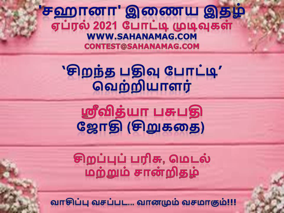 “சஹானா” இணைய இதழின் ஏப்ரல் 2021 போட்டிகளில் கலந்து கொண்டு சிறப்பித்த அனைவருக்கும் மனமார்ந்த வாழ்த்துக்கள்.