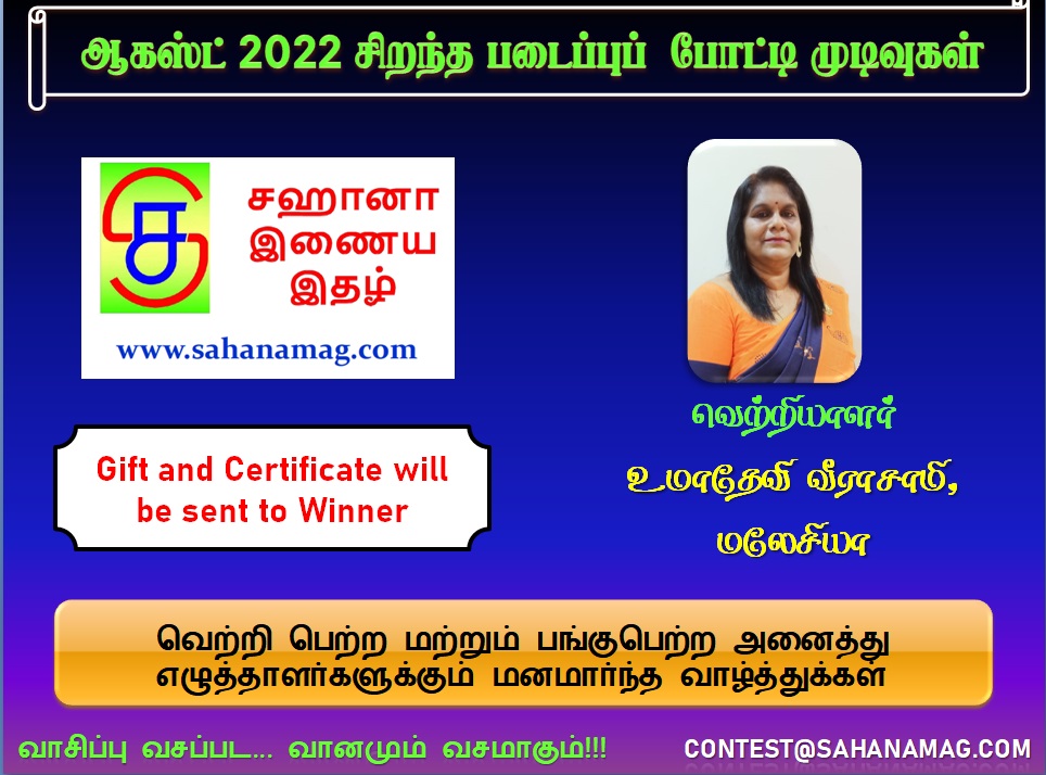 ஆகஸ்ட் 2022 மாதத்தின் சிறந்த படைப்பு போட்டியின் வெற்றியாளர் விவரத்தை இந்த பதிவின் மூலம் பகிர்வதில் மகிழ்ச்சி கொள்கிறோம்.