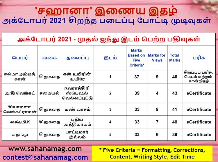 அக்டோபர் மாத, மாதாந்திர சிறந்த படைப்பு போட்டியில் பங்கு பெற்றவர்களில், வெற்றி பெற்றவர்களின் விவரங்கள் பின் வருமாறு:-