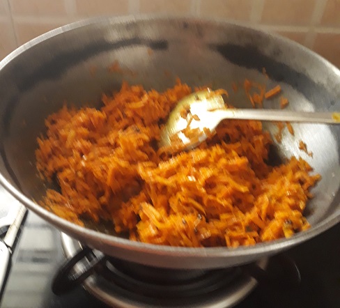- துருவிய மஞ்சளைச்சேர்த்து, நன்கு வதக்கவும்.