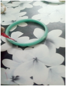 2. முதலில் ஒரு வளையலை எடுத்து, வளையலின் உள்பக்கம் சிறிது கம் வைத்து அதில் பட்டுநூலை படத்தில் காட்டியவாறு ஒட்டி, வளையலை சுற்றி பட்டு நூலை சுற்றவும்