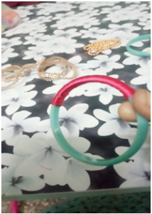 3. பிறகு அதில் ஸ்டோன் லேஸ்ஸை வளையலை சுற்றி ஒட்டவும்
