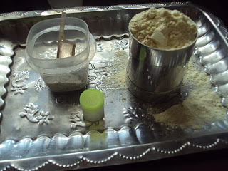 - குட்டி டப்பாவில் பச்சைக் கற்பூரம். மற்றத் தேவையான பொருட்கள், முன்னால் இருப்பது அரை லிட்டர் பால், பக்கத்தில் நெய், பின்னால் கவரில் சர்க்கரை, பக்கத்தில் முந்திரி, பாதாம் பொடித்தது!